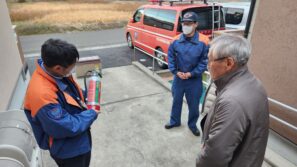 ※ホーム職員 (署員より消火器の説明を受ける)
